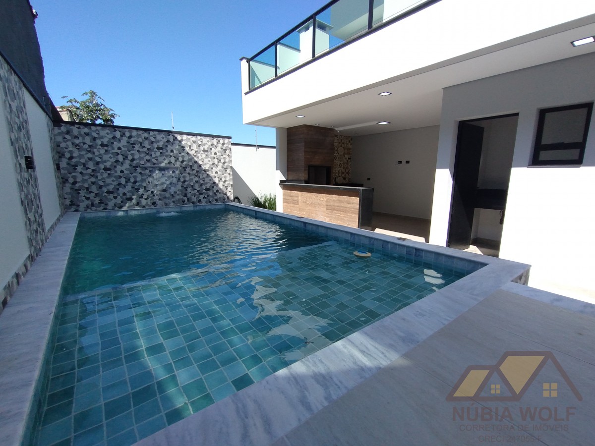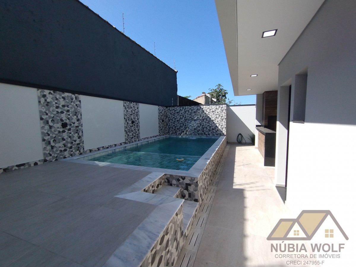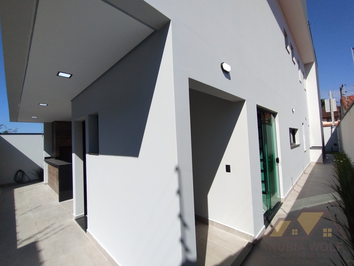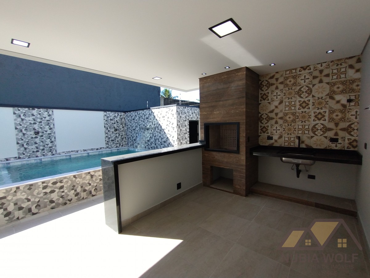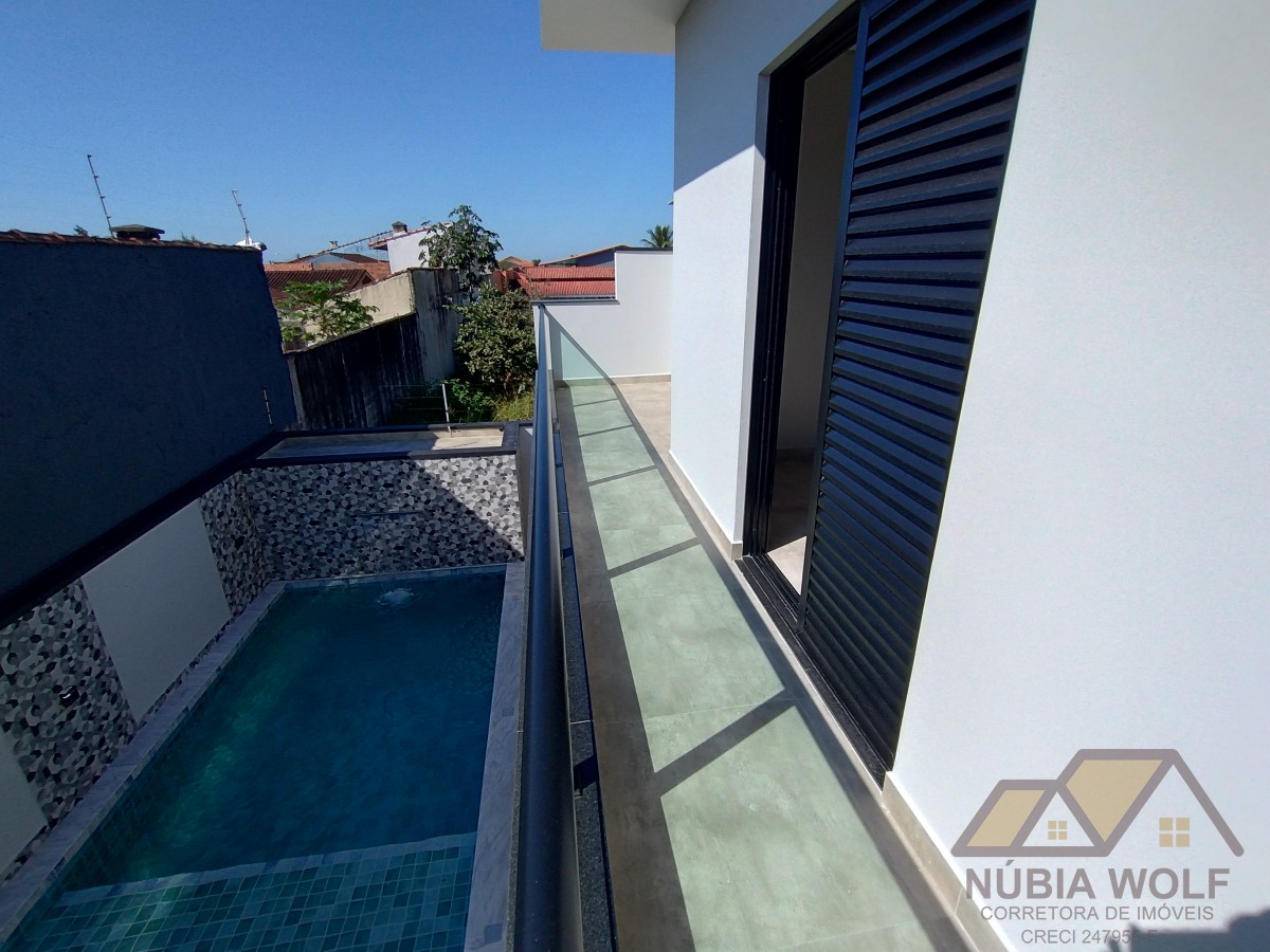 Sobrado novo para venda em Peruíbe com 4 dormitórios sendo 3 suítes, 1 com closet, sacada, jardim, lavanderia, banheiro social, banheiro de lazer, piscina com cascata, vaga para 4 carros. Pé direito duplo, acabamento impecável.